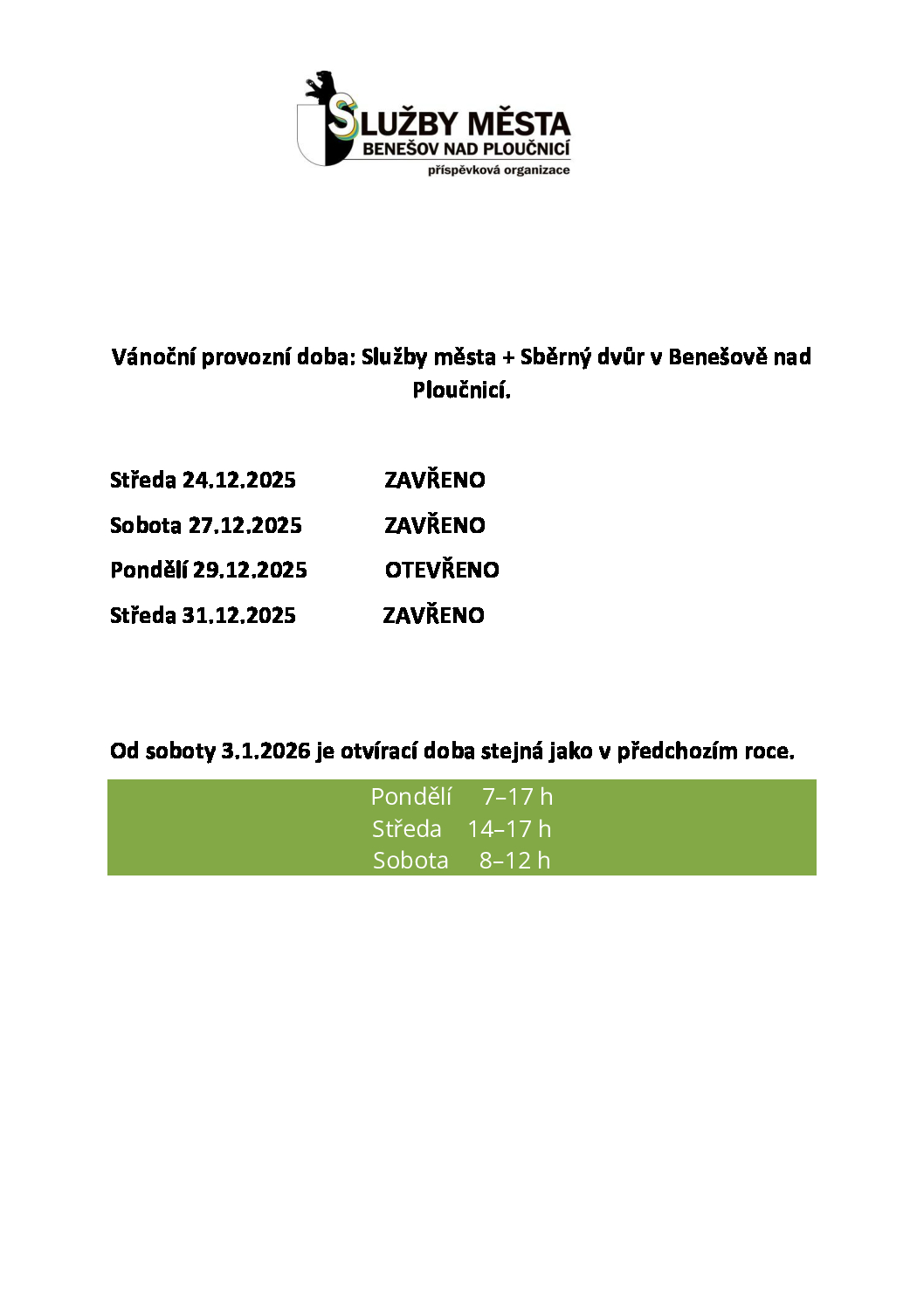 Vánoční provozní doba: Služby města + Sběrný dvůr v Benešově nad Ploučnicí.